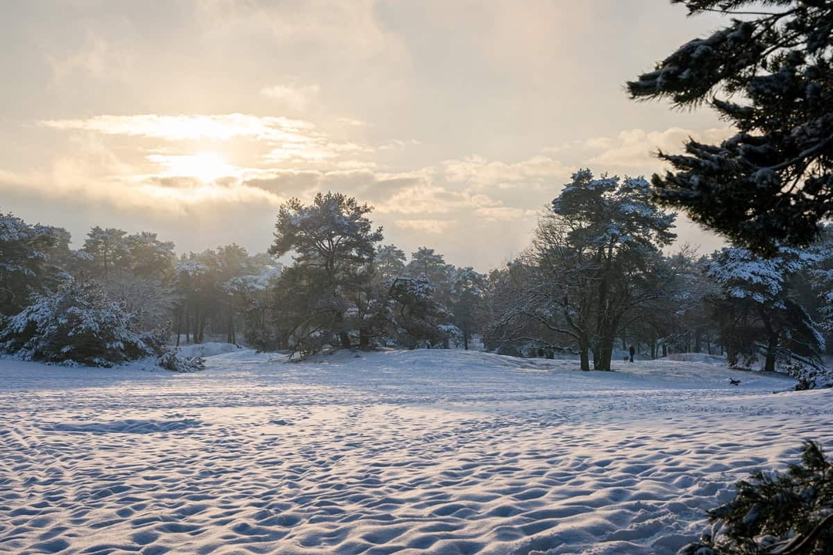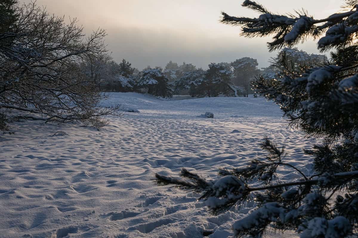 De winterse omstandigheden zijn ook duidelijk zichtbaar in de Soesterduinen. Het landschap ligt er volledig wit bij, waarbij de sneeuw de glooiende vormen extra benadrukt. Hierdoor krijgen de duinen een heel ander karakter dan in andere seizoenen en oogt het gebied rustiger en uitgestrekter, met weinig kleurverschillen.
