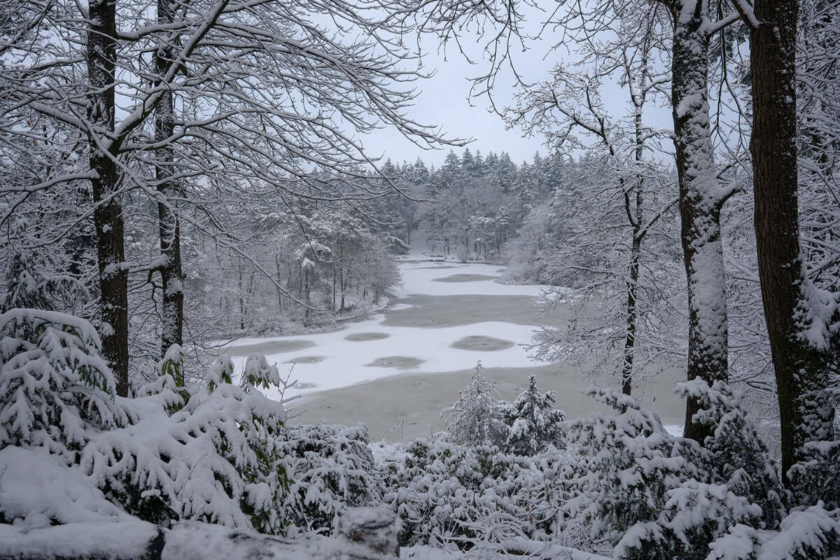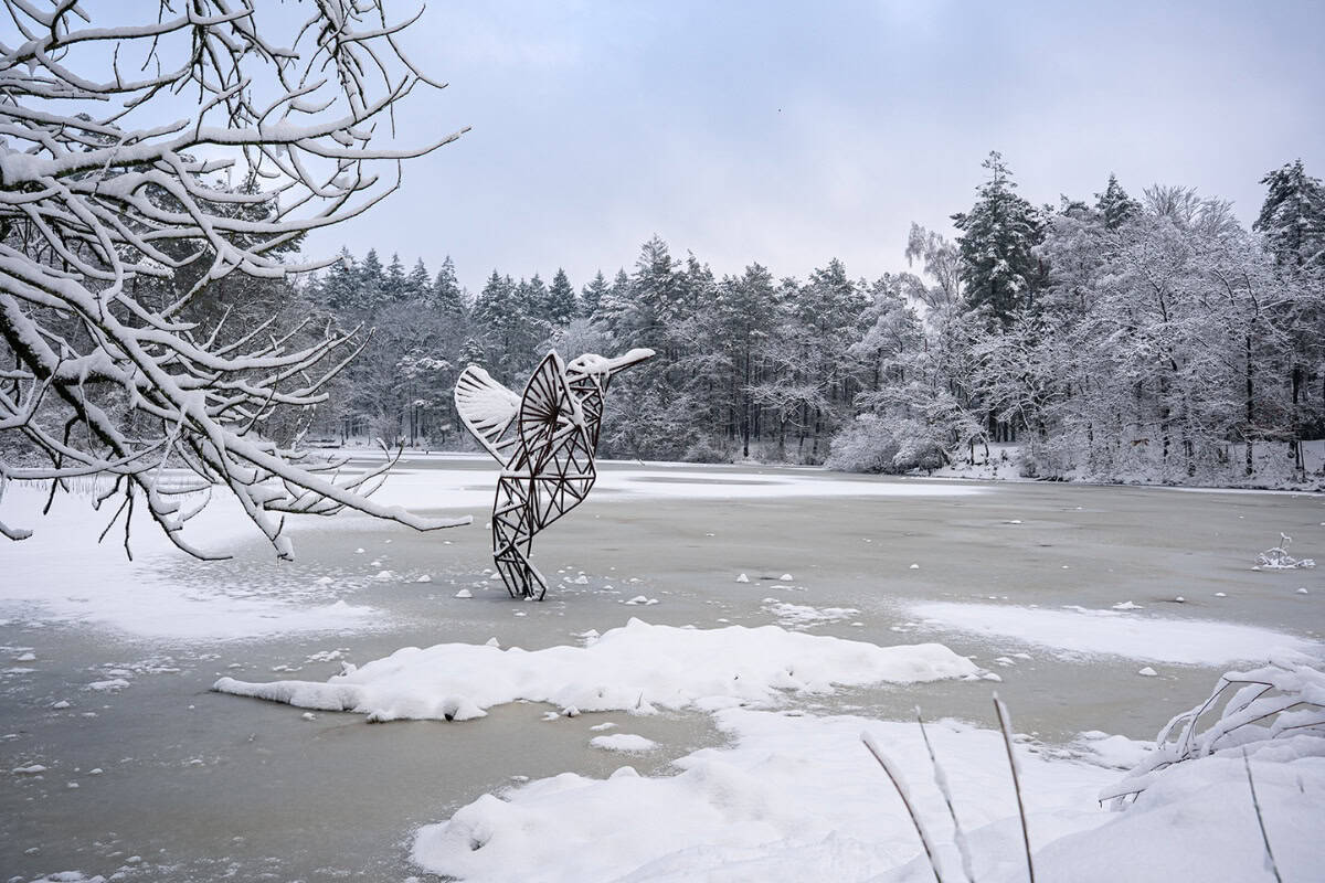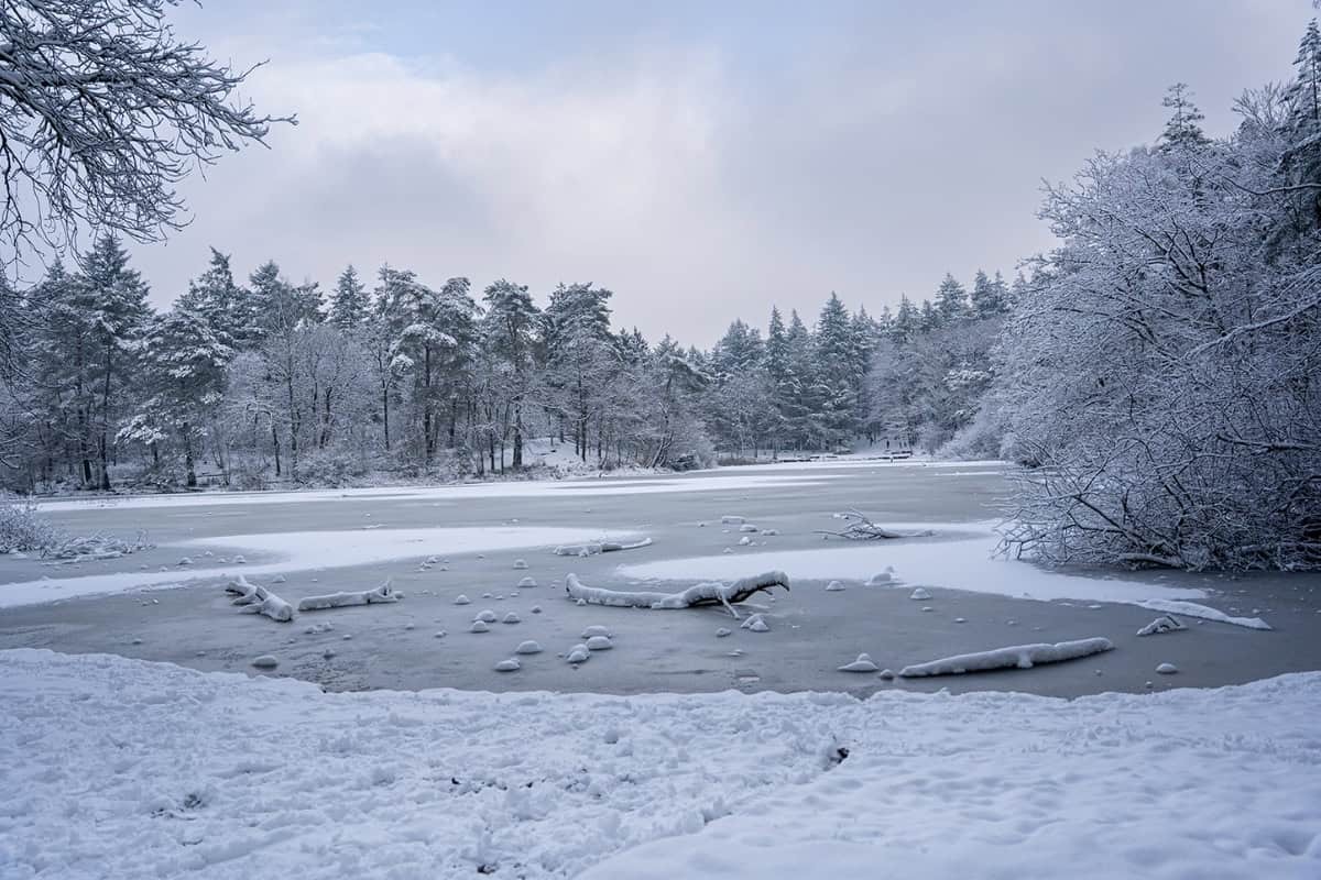 Door de aanhoudende vorst zijn de bosvijvers en het meer in de omgeving volledig bevroren. In combinatie met de besneeuwde bomen en het lage winterlicht levert dit opvallende winterse beelden op. Op sommige plekken is het ijs zo egaal dat het landschap nauwelijks nog als waterpartij te herkennen is.