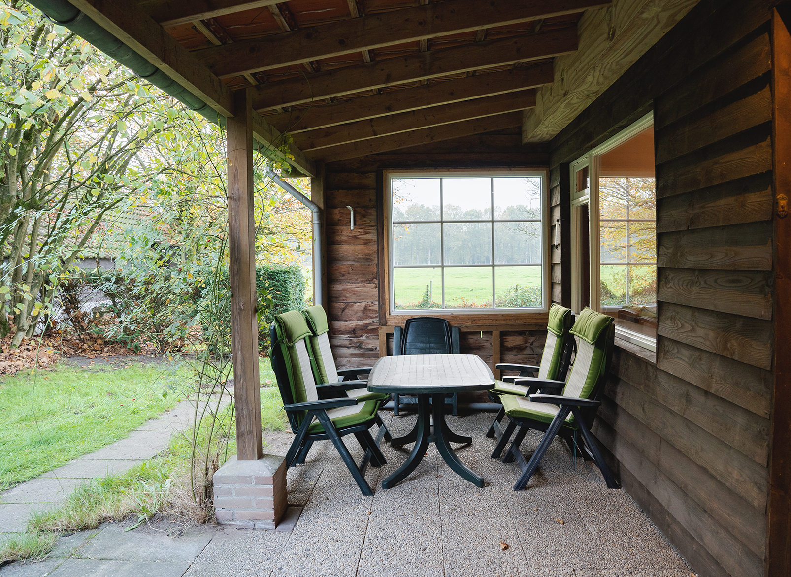 Het terras biedt een fantastisch uitzicht over het weiland. Hier grazen de paarden van stichting de Paardenkamp, en daarbij is de kans groot dat u een groep reetjes spot tijdens uw verblijf.